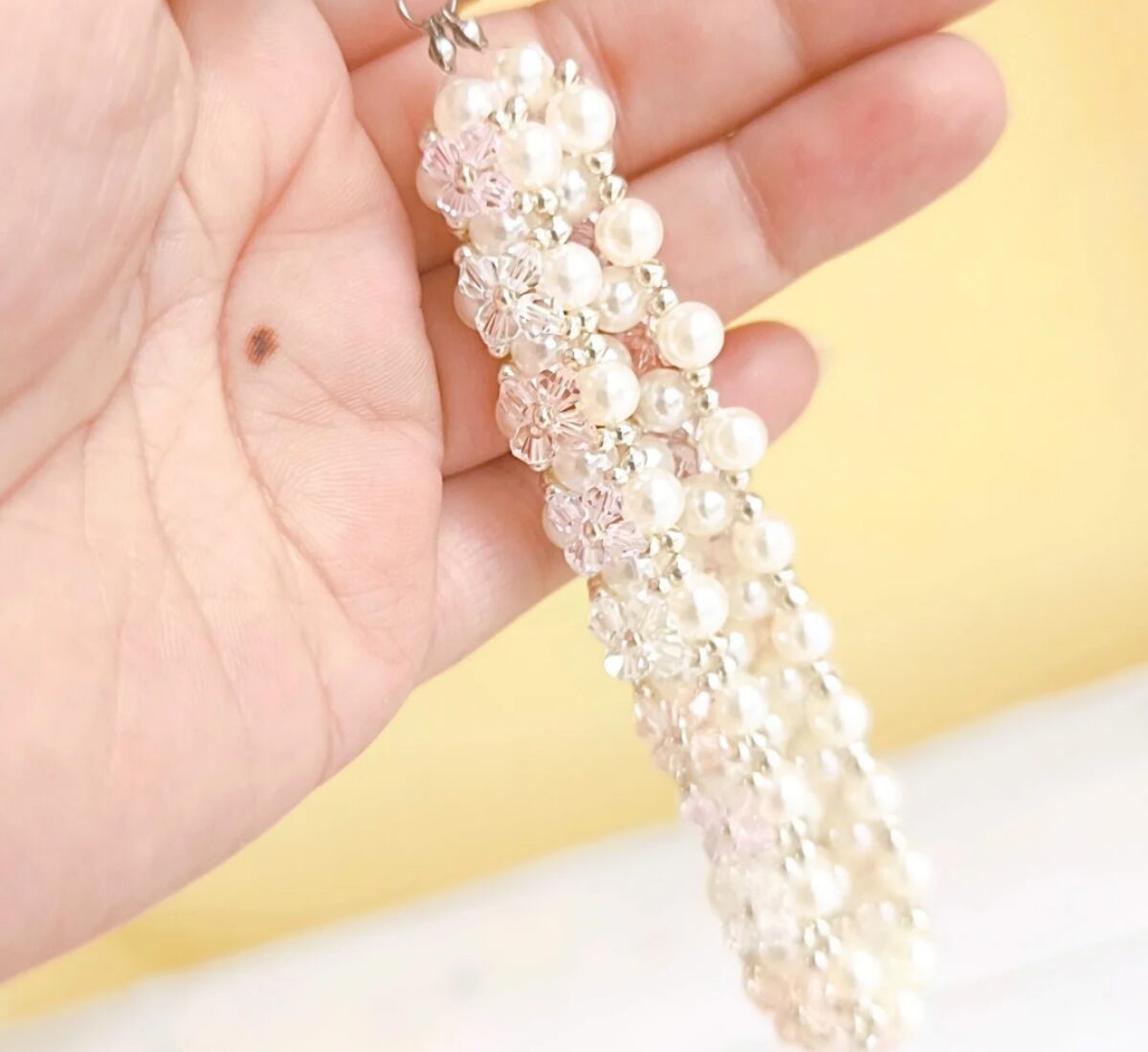 キラキラ輝くガラスビーズのお花と上品パールのハンドストラップ バッグチャーム